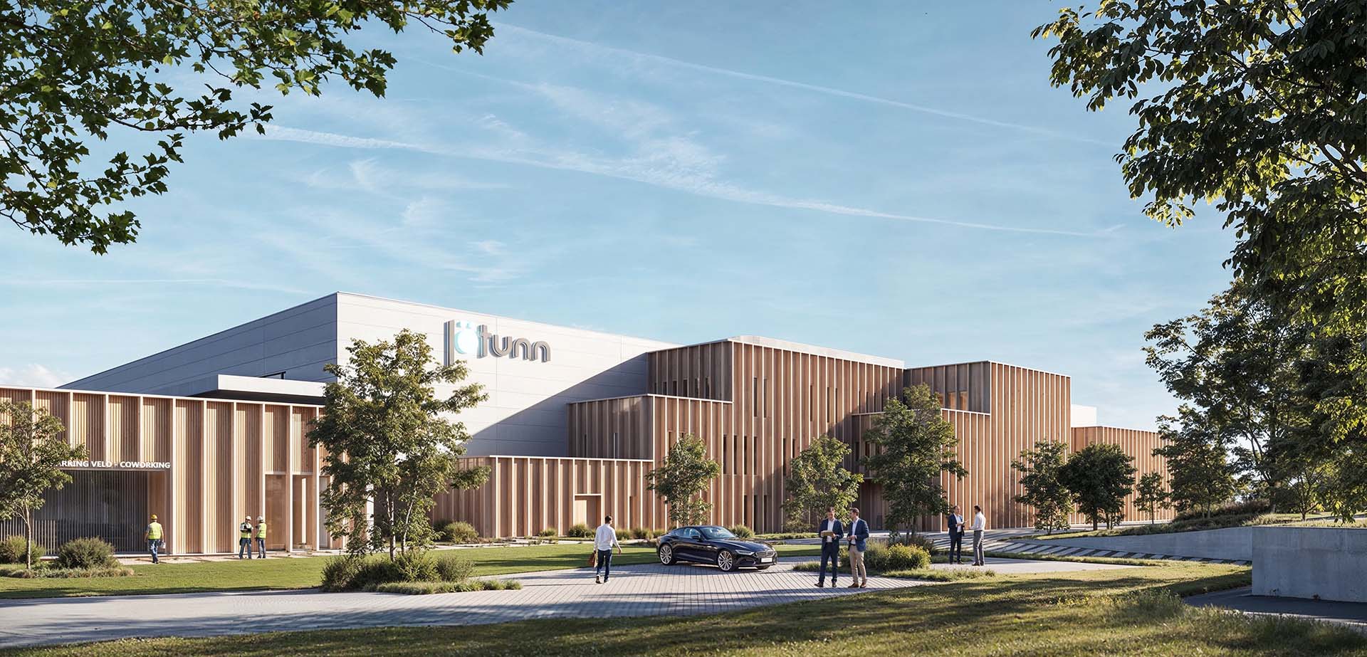 Pensé comme une extension naturelle de l’identité de l’entreprise, le projet traduit en architecture les valeurs fondatrices de Jötunn : innovation, modularité et durabilité. Le programme regroupe deux halls industriels de 12.000 m² et 2.000 m², un bâtiment de bureaux de 1.800 m² sur trois niveaux, un espace de coworking de 150 m², ainsi que des aménagements extérieurs structurés autour d’un axe paysager traversant.